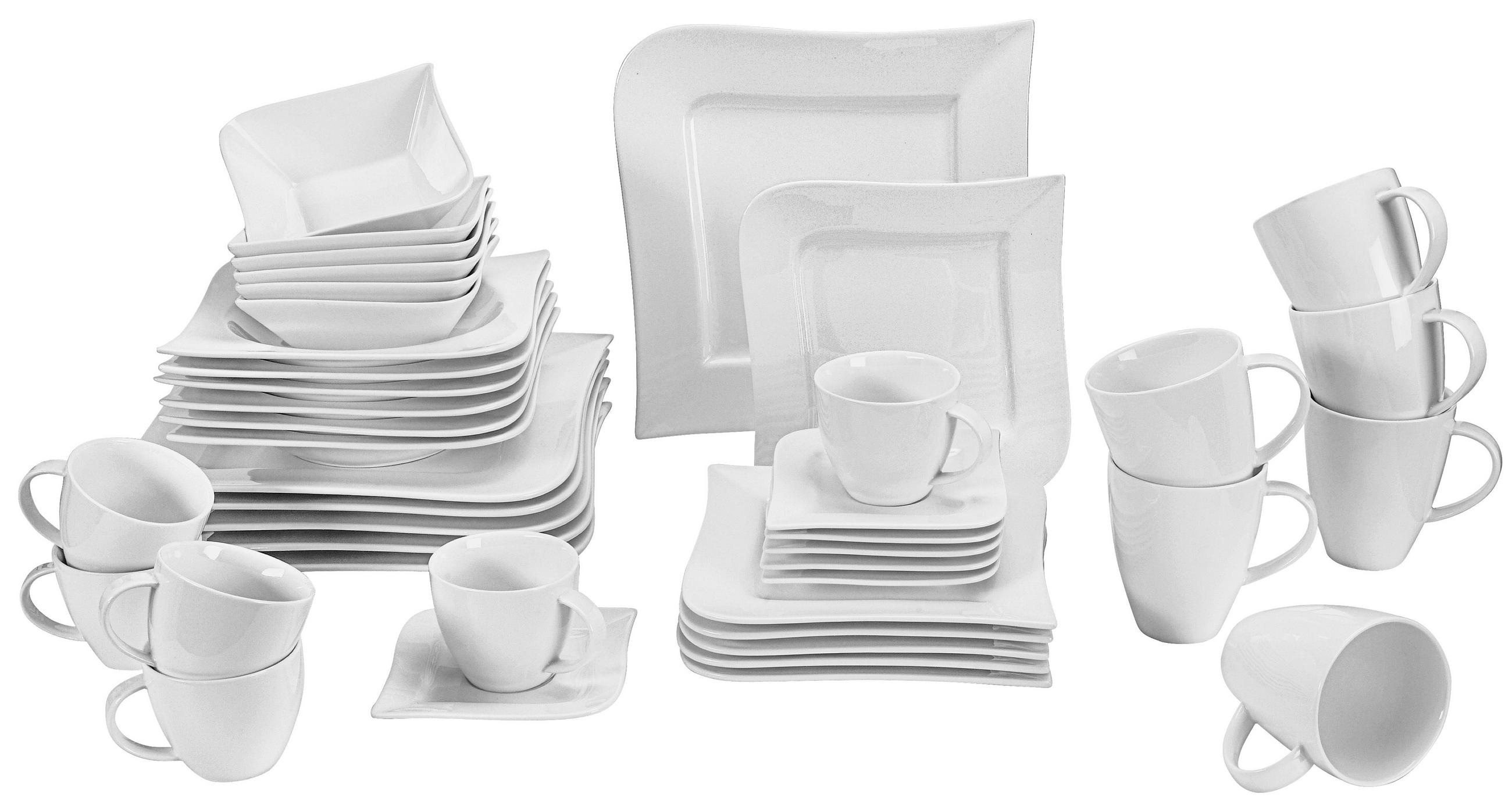 Das geschirr ist aus porzellan gefertigt und in klassischem weiß gehalten.