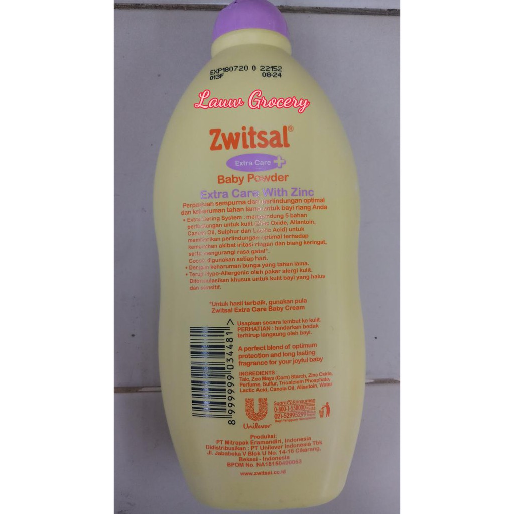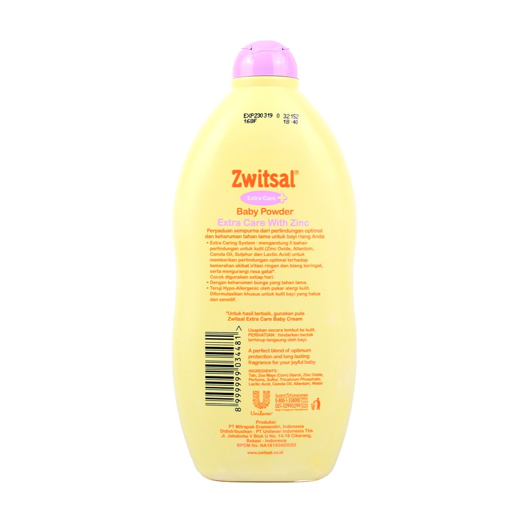 Baby powder extra care with zinc bedak yang mengandung 5 bahan perlindungan untuk kulit yaitu zinc allantoin canola oil sulphur dan lactic acid.