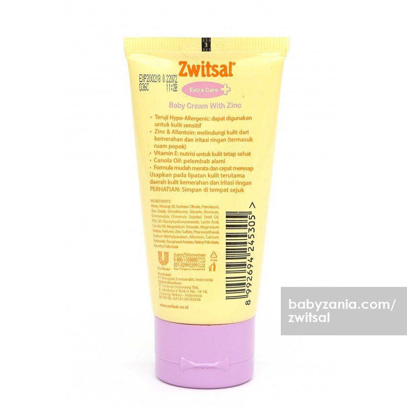 Zwitsal baby cream with zinc mengandung zinc yang membantu meringankan kemerahan dan iritasi ringan allantoin yang membantu meringankan luka iritasi ringan vitamin e yang menutrisi kulit agar tetap sehat serta canola oil yang dapat melembabkan kulit secara alami.